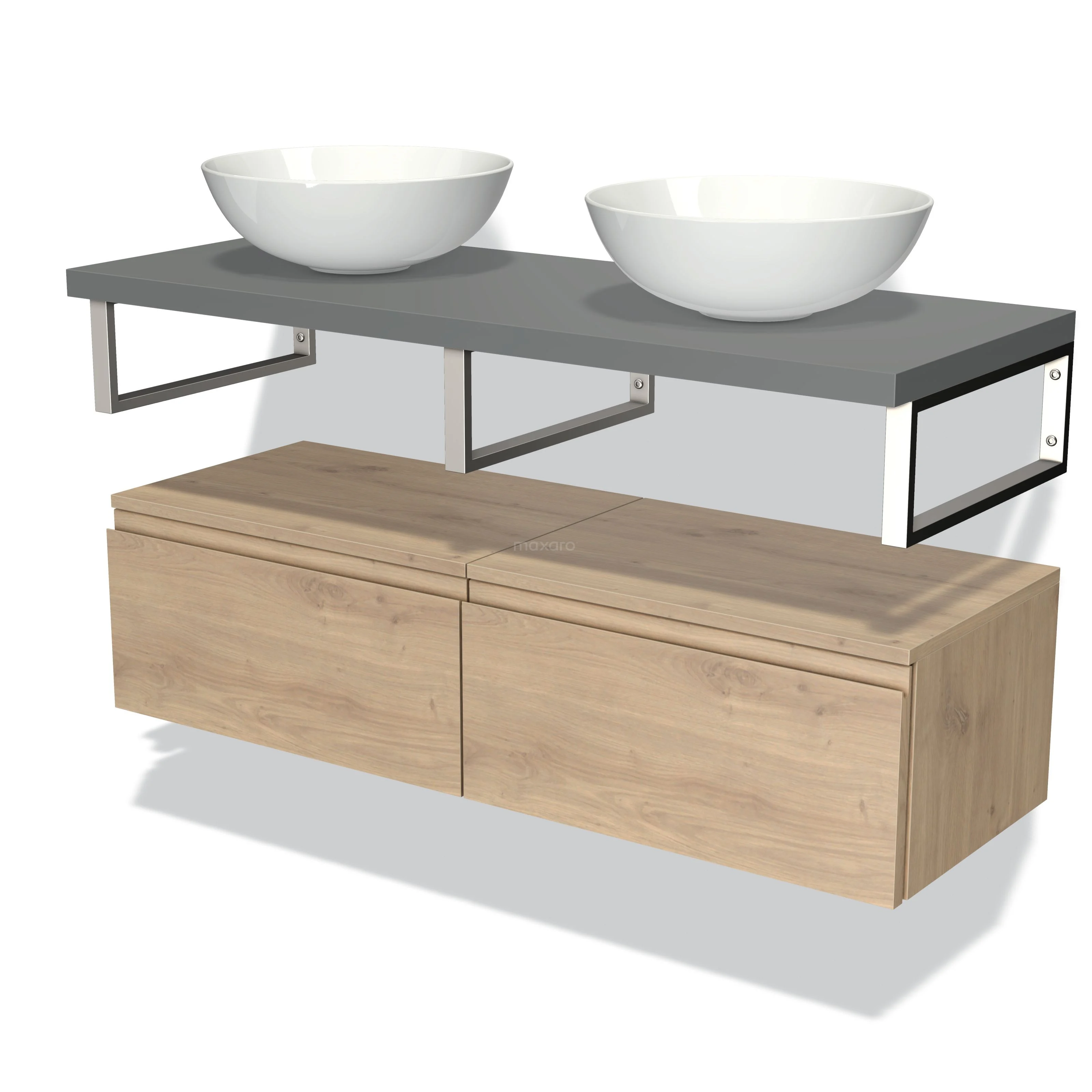 Modulo Plato Badmöbel mit Aufsatzwaschbecken | 120 cm Hellbraune Eiche Grifflos front Mittelgrau blatt Tief hängend
