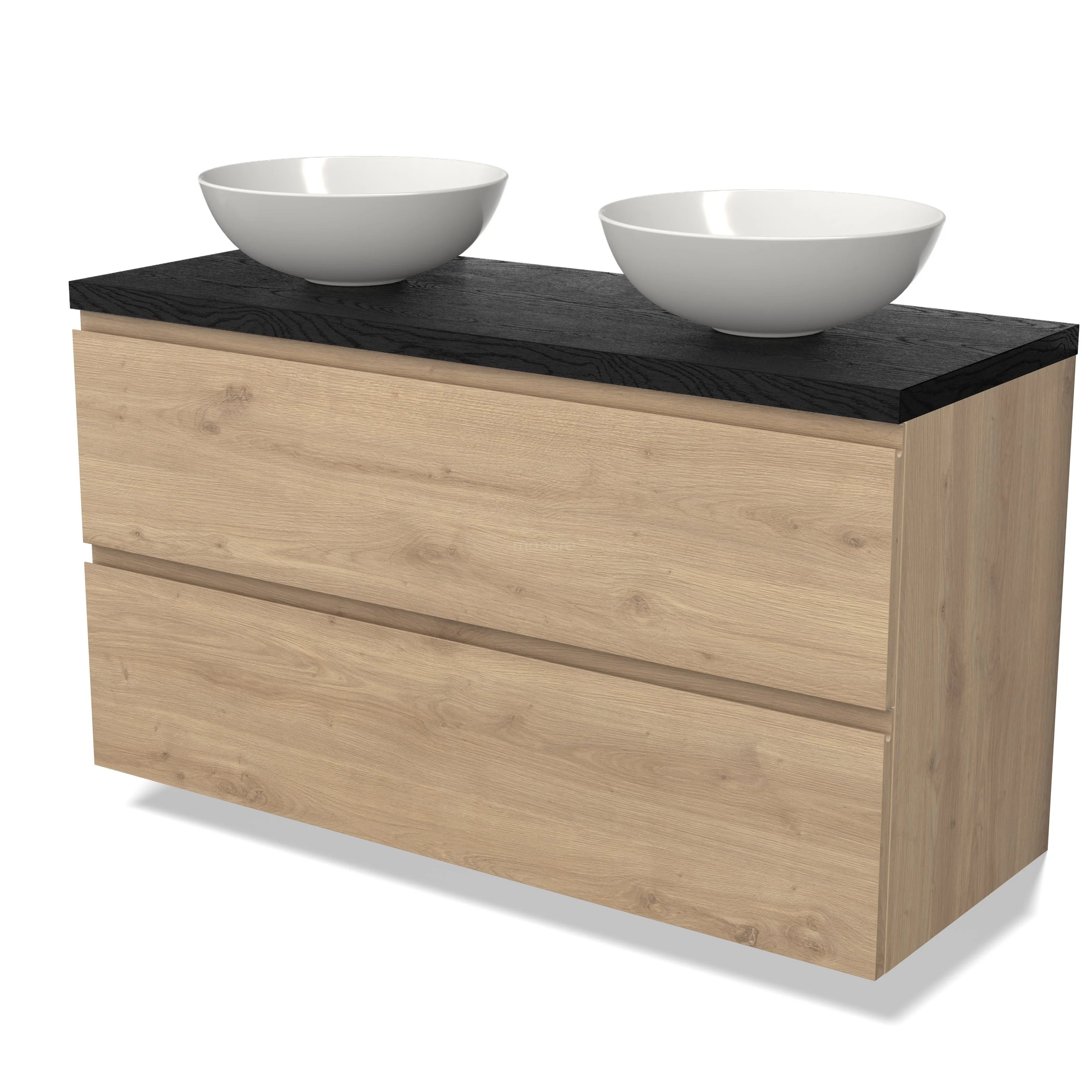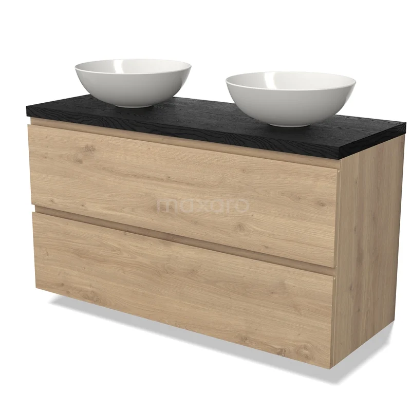 Modulo Plato Badmöbel mit Aufsatzwaschbecken | 120 cm Hellbraune Eiche Grifflos front Schwarze Eiche blatt 2 übereinanderliegende Schubladen