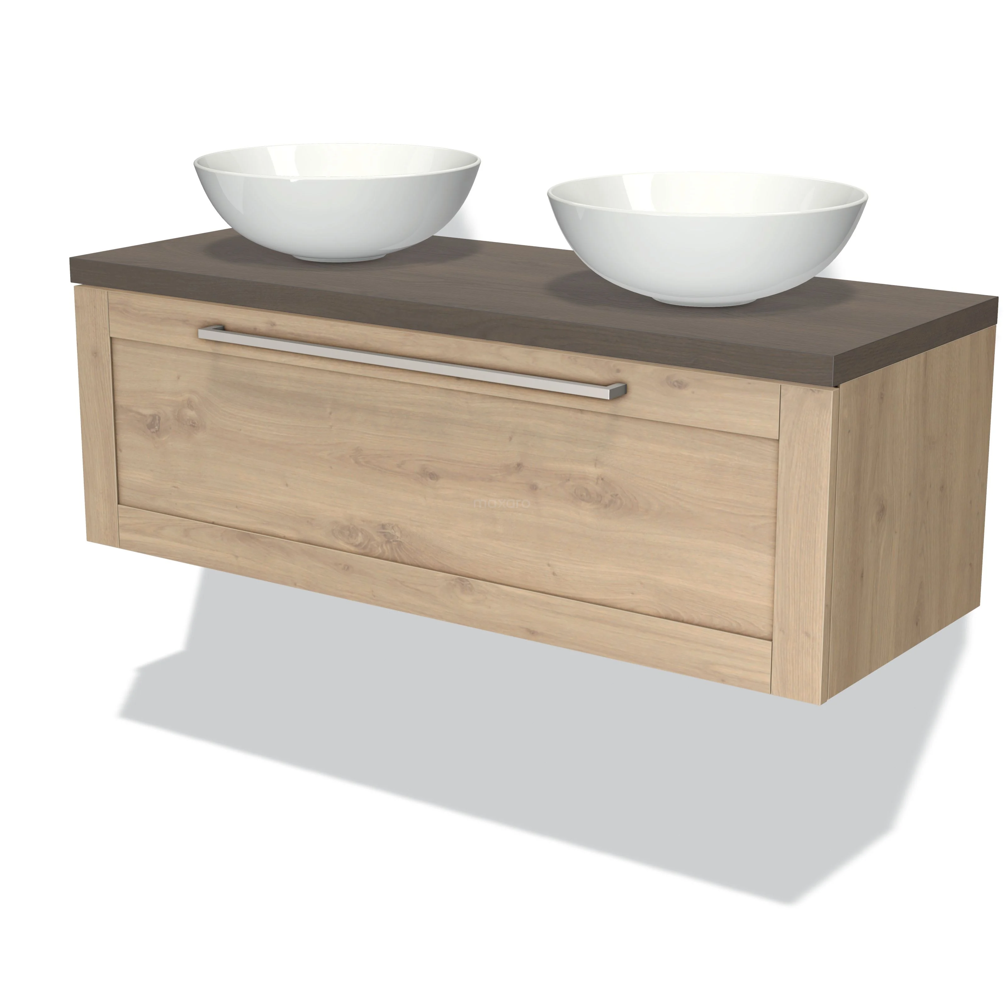 Modulo Plato Badmöbel mit Aufsatzwaschbecken | 120 cm Hellbraune Eiche Rahmen front Dunkelbraune Eiche blatt 1 Schublade