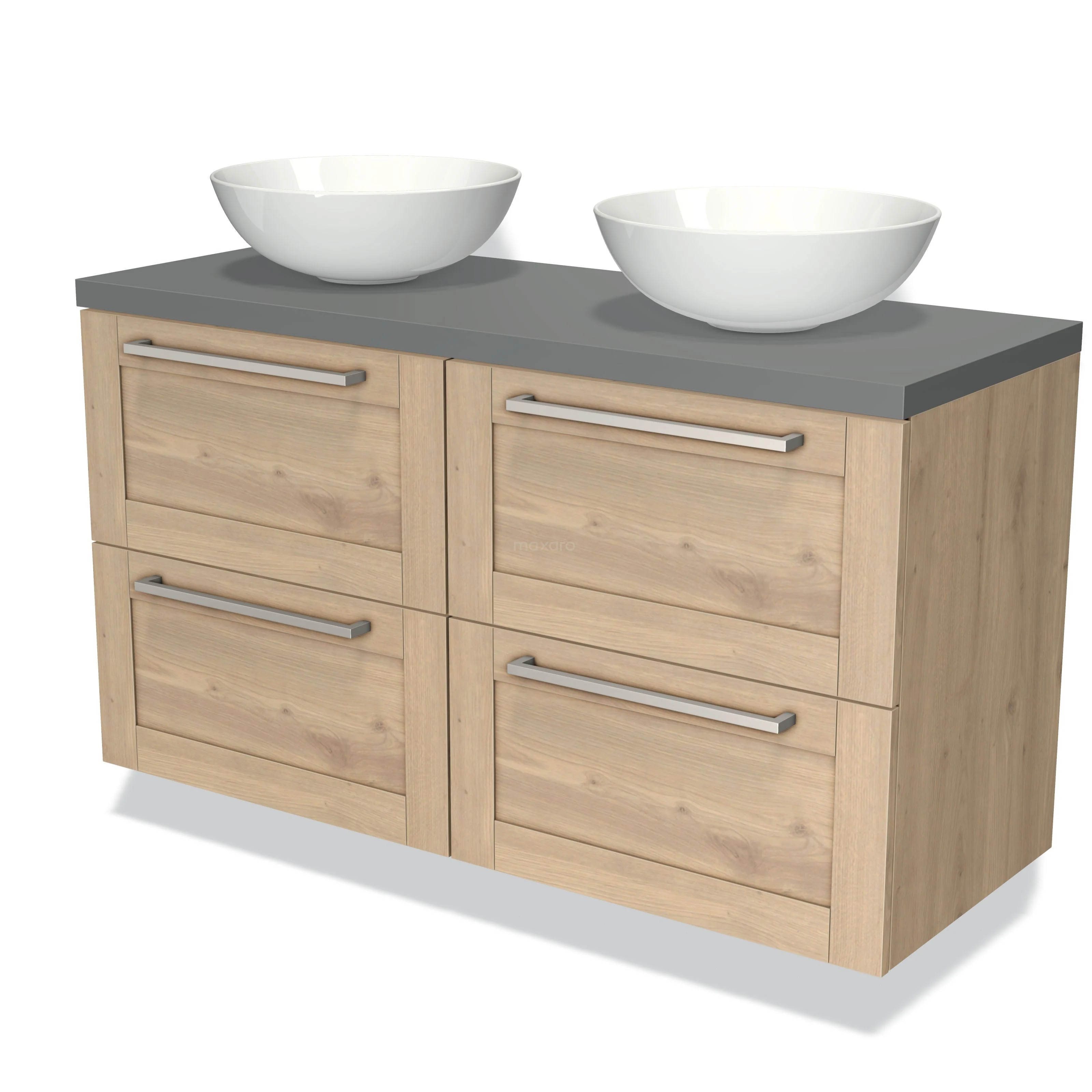 Modulo Plato Badmöbel mit Aufsatzwaschbecken | 120 cm Hellbraune Eiche Rahmen front Mittelgrau blatt 4 Schubladen