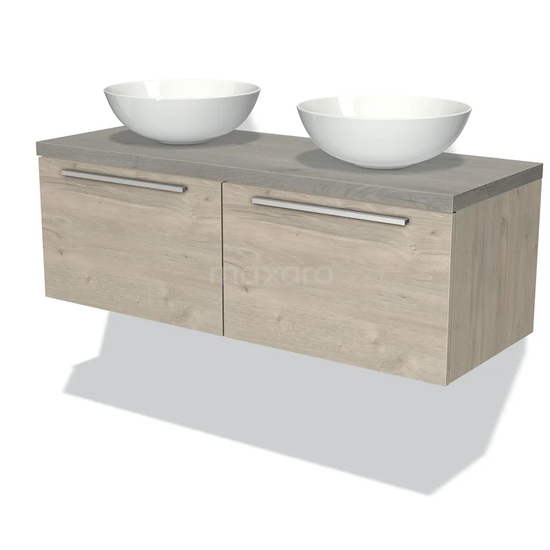 Modulo Plato Badmöbel mit Aufsatzwaschbecken | 120 cm Hellgraue Eiche Flach front Graue Eiche blatt 2 nebeneinanderliegende Schubladen