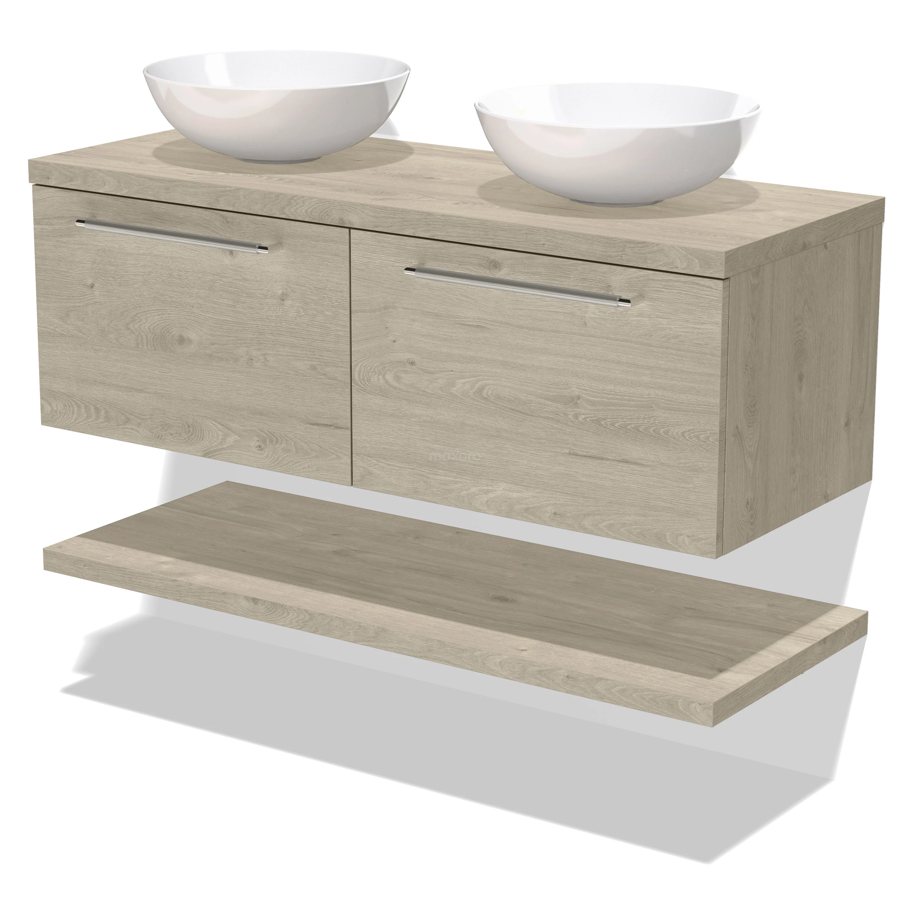 Modulo Plato Badmöbel mit Aufsatzwaschbecken | 120 cm Hellgraue Eiche Flach front Hellgraue Eiche blatt 2 nebeneinanderliegende Schubladen