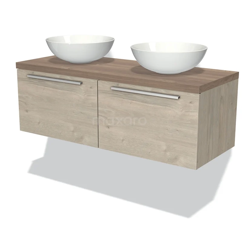 Modulo Plato Badmöbel mit Aufsatzwaschbecken | 120 cm Hellgraue Eiche Flach front Mittelbraune Eiche blatt 2 nebeneinanderliegende Schubladen