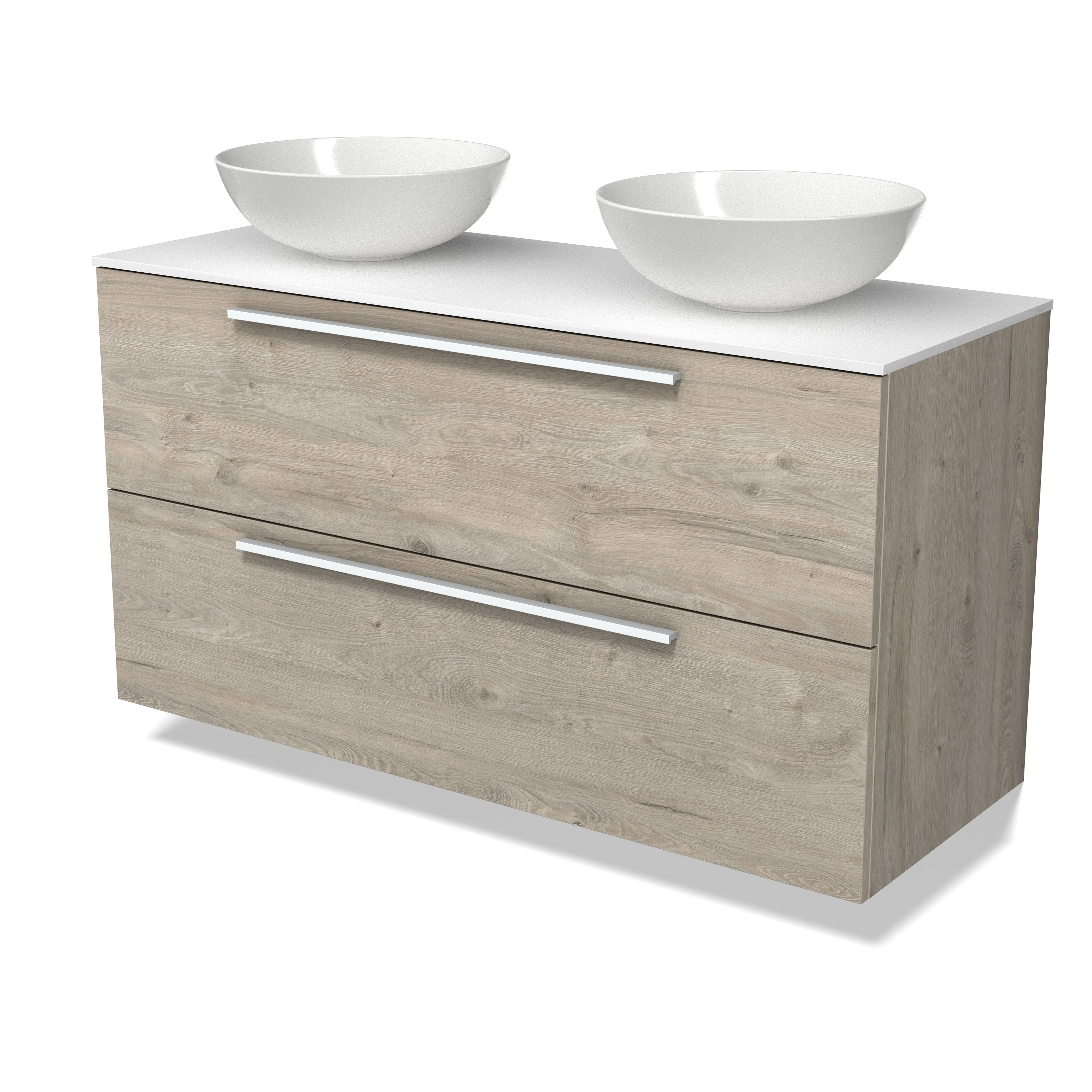 Modulo Plato Badmöbel mit Aufsatzwaschbecken | 120 cm Hellgraue Eiche Flach front Solid Surface blatt 2 übereinanderliegende Schubladen