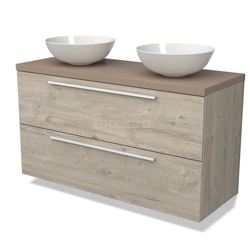 Modulo Plato Badmöbel mit Aufsatzwaschbecken | 120 cm Hellgraue Eiche Flach front Taupe blatt 2 übereinanderliegende Schubladen