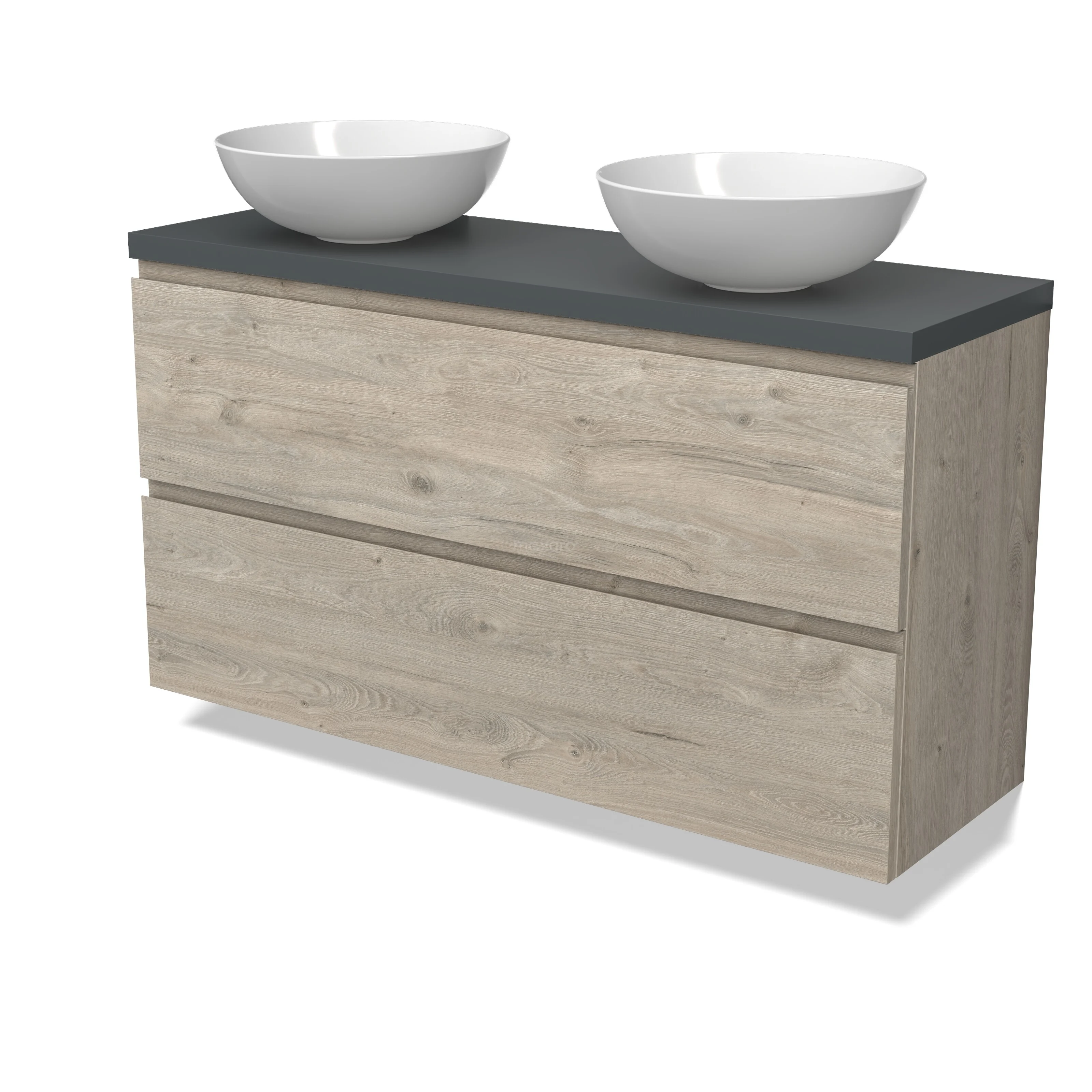 Modulo Plato Badmöbel mit Aufsatzwaschbecken | 120 cm Hellgraue Eiche Grifflos front Dunkelgrau blatt 2 übereinanderliegende Schubladen