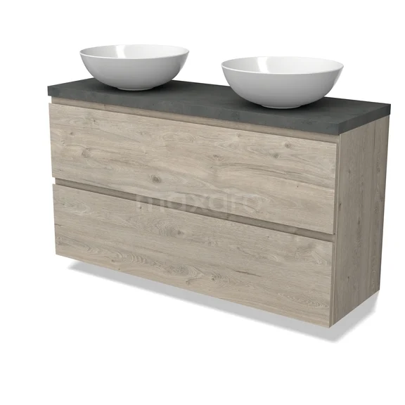 Modulo Plato Badmöbel mit Aufsatzwaschbecken | 120 cm Hellgraue Eiche Grifflos front Dunkelgrauer Beton blatt 2 übereinanderliegende Schubladen