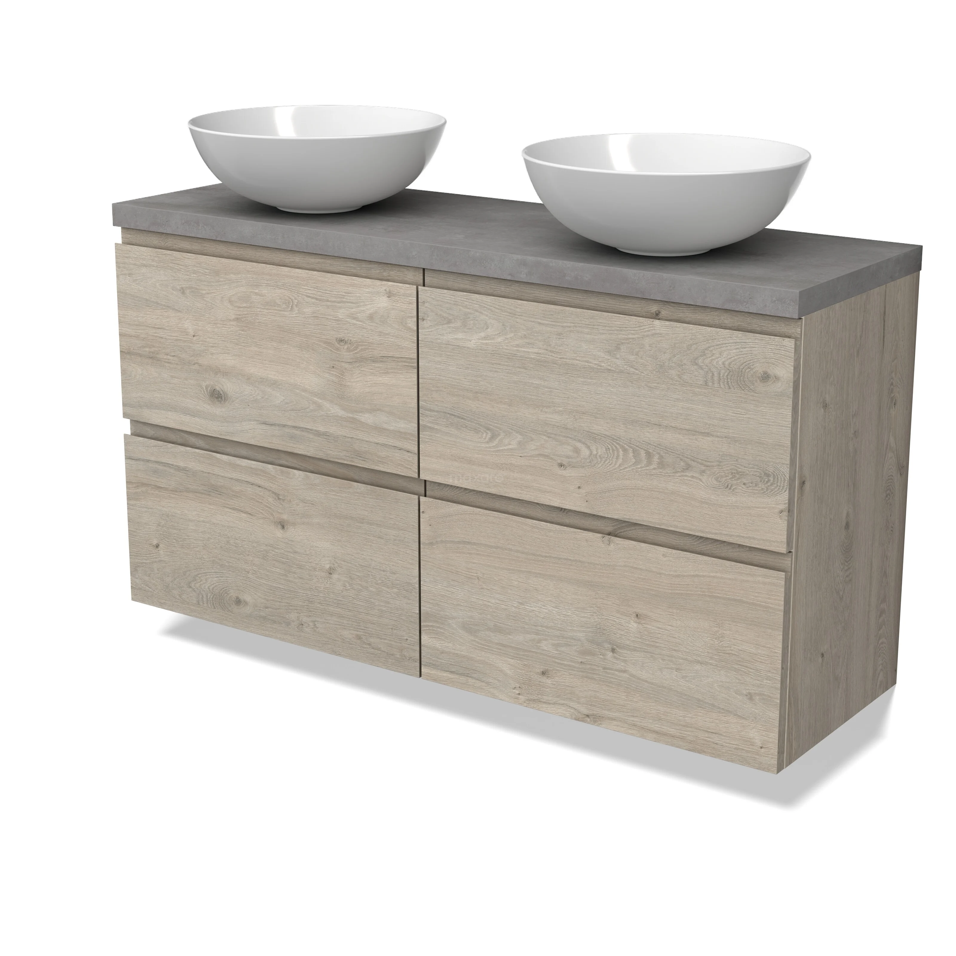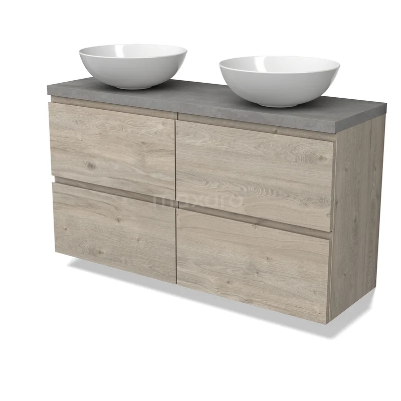 Modulo Plato Badmöbel mit Aufsatzwaschbecken | 120 cm Hellgraue Eiche Grifflos front Hellgrauer Beton blatt 4 Schubladen
