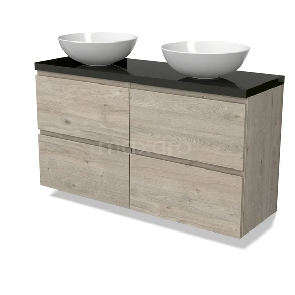 Modulo Plato Badmöbel mit Aufsatzwaschbecken | 120 cm Hellgraue Eiche Grifflos front Hochglanz Schwarz blatt 4 Schubladen