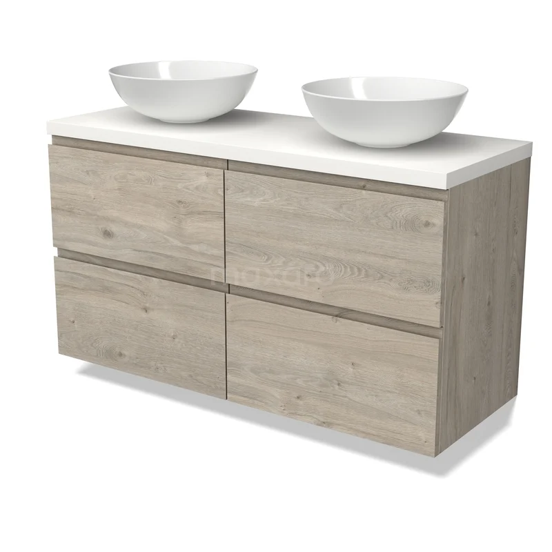 Modulo Plato Badmöbel mit Aufsatzwaschbecken | 120 cm Hellgraue Eiche Grifflos front Matt Weiß blatt 4 Schubladen
