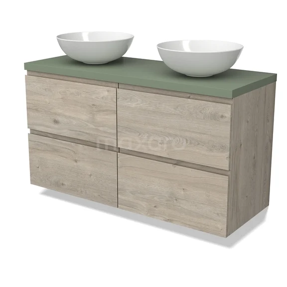 Modulo Plato Badmöbel mit Aufsatzwaschbecken | 120 cm Hellgraue Eiche Grifflos front Salbeigrün blatt 4 Schubladen