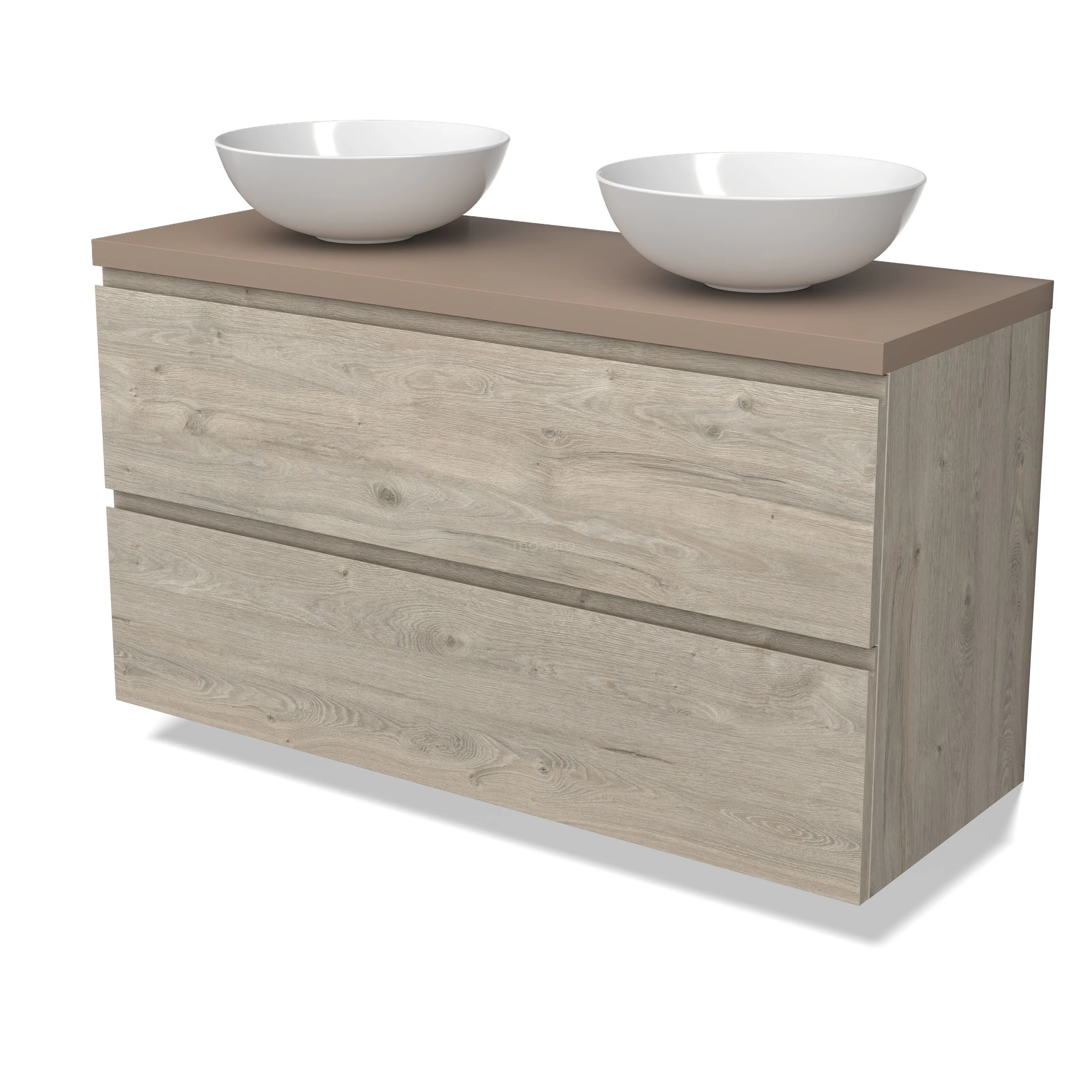Modulo Plato Badmöbel mit Aufsatzwaschbecken | 120 cm Hellgraue Eiche Grifflos front Taupe blatt 2 übereinanderliegende Schubladen