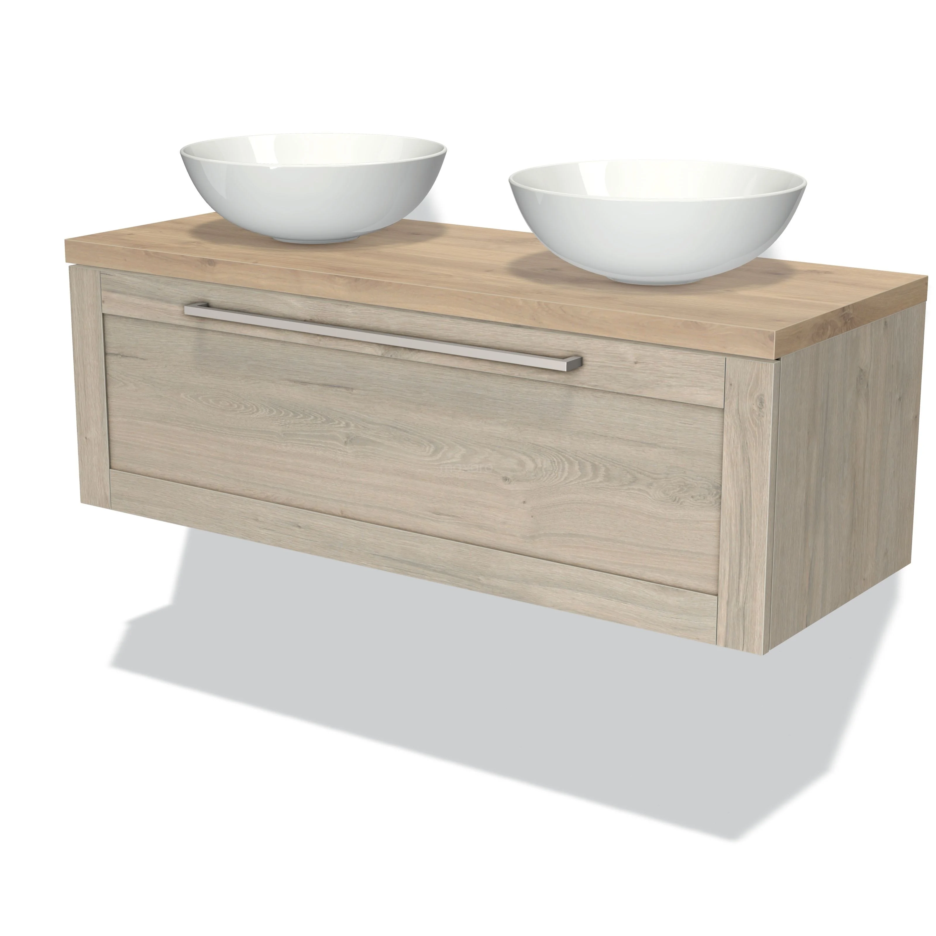 Modulo Plato Badmöbel mit Aufsatzwaschbecken | 120 cm Hellgraue Eiche Rahmen front Hellbraune Eiche blatt 1 Schublade