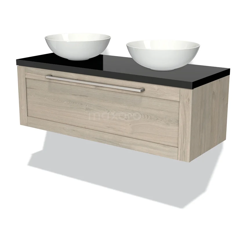Modulo Plato Badmöbel mit Aufsatzwaschbecken | 120 cm Hellgraue Eiche Rahmen front Hochglanz Schwarz blatt 1 Schublade
