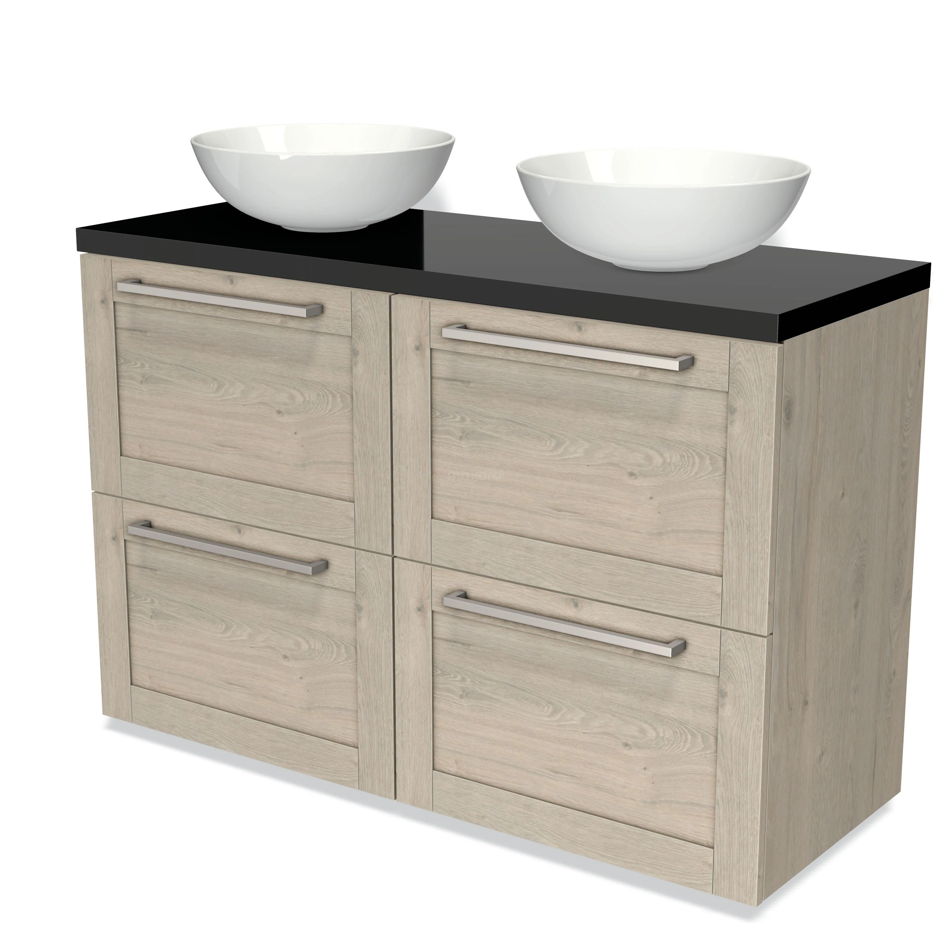 Modulo Plato Badmöbel mit Aufsatzwaschbecken | 120 cm Hellgraue Eiche Rahmen front Hochglanz Schwarz blatt 4 hohe Schubladen
