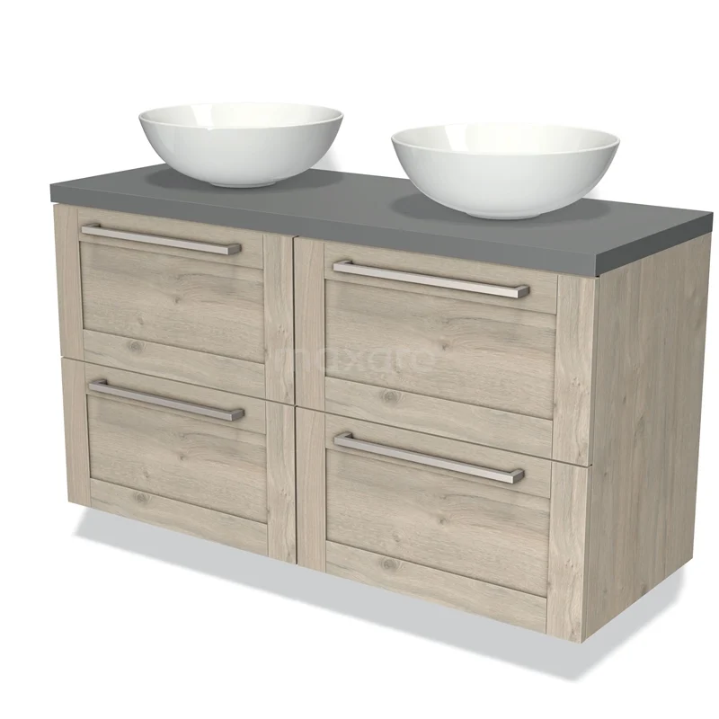 Modulo Plato Badmöbel mit Aufsatzwaschbecken | 120 cm Hellgraue Eiche Rahmen front Mittelgrau blatt 4 Schubladen