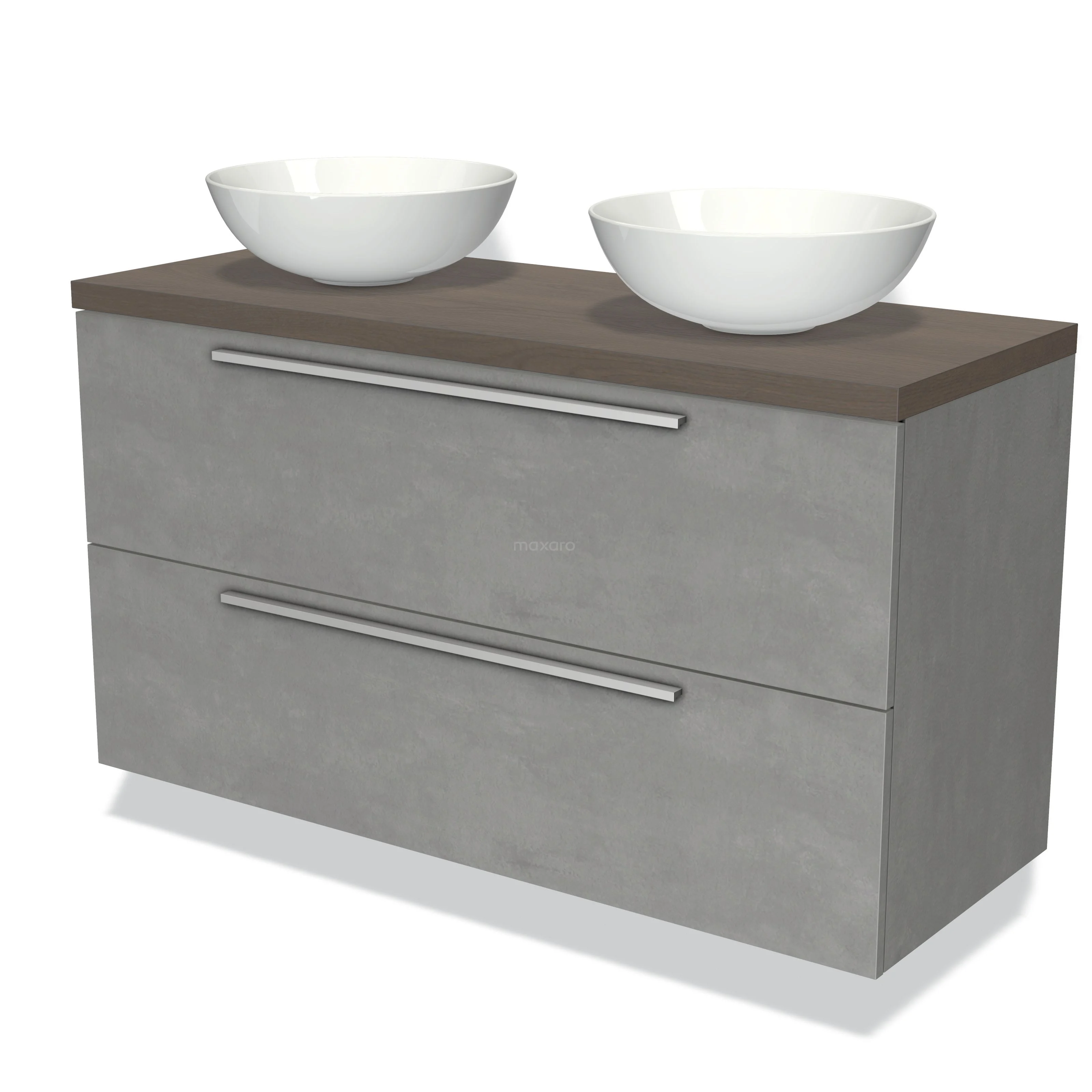 Modulo Plato Badmöbel mit Aufsatzwaschbecken | 120 cm Hellgrauer Beton Flach front Dunkelbraune Eiche blatt 2 übereinanderliegende Schubladen