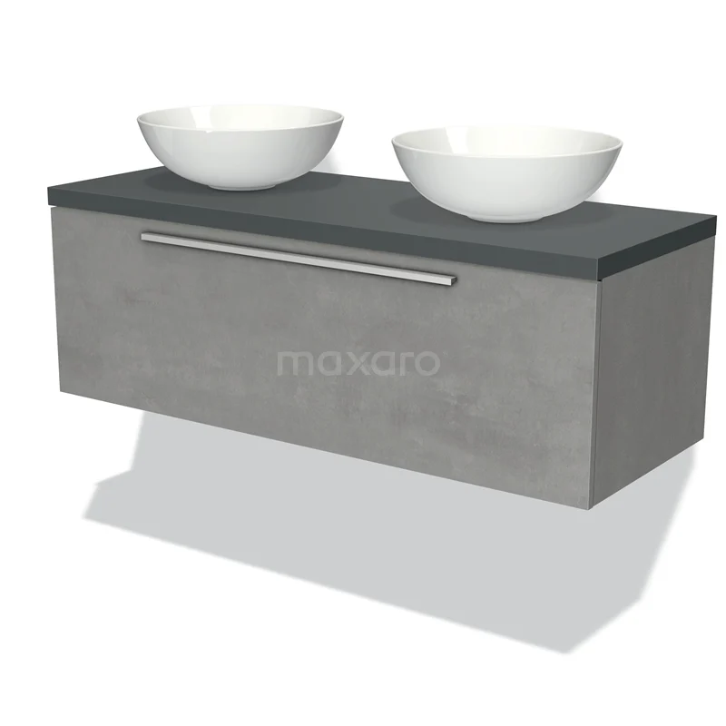 Modulo Plato Badmöbel mit Aufsatzwaschbecken | 120 cm Hellgrauer Beton Flach front Dunkelgrau blatt 1 Schublade