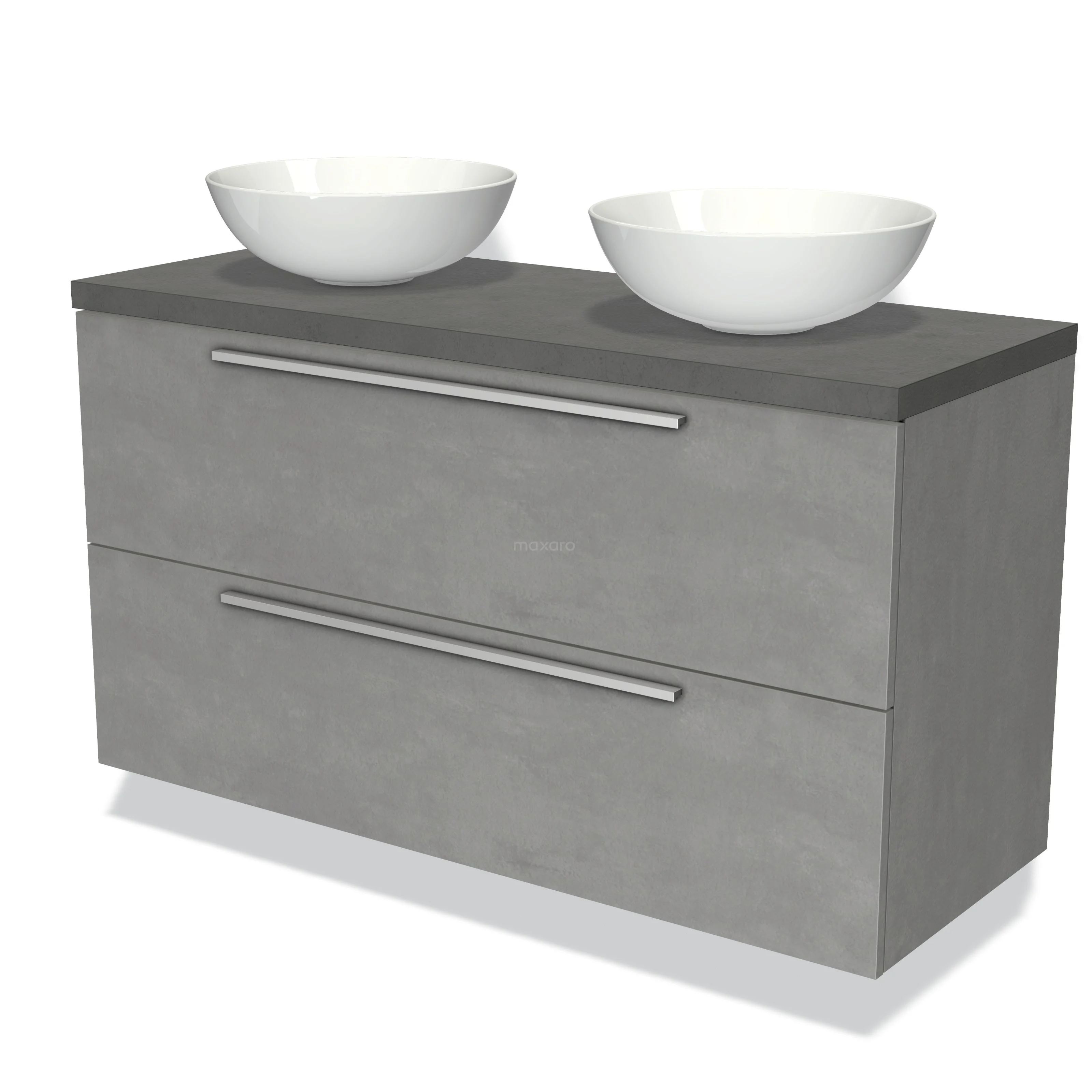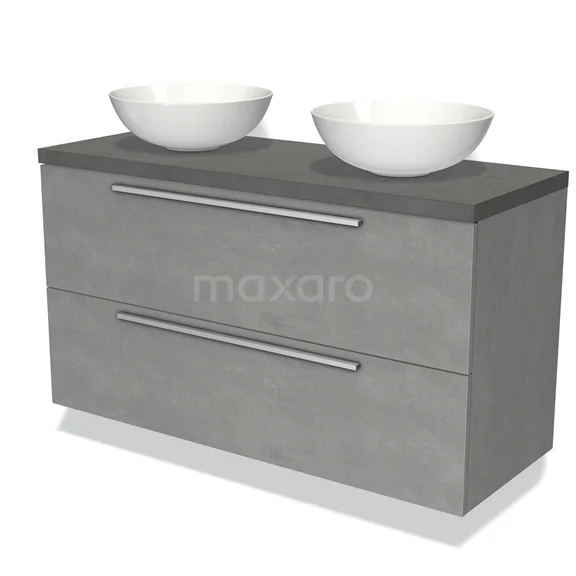 Modulo Plato Badmöbel mit Aufsatzwaschbecken | 120 cm Hellgrauer Beton Flach front Dunkelgrauer Beton blatt 2 übereinanderliegende Schubladen