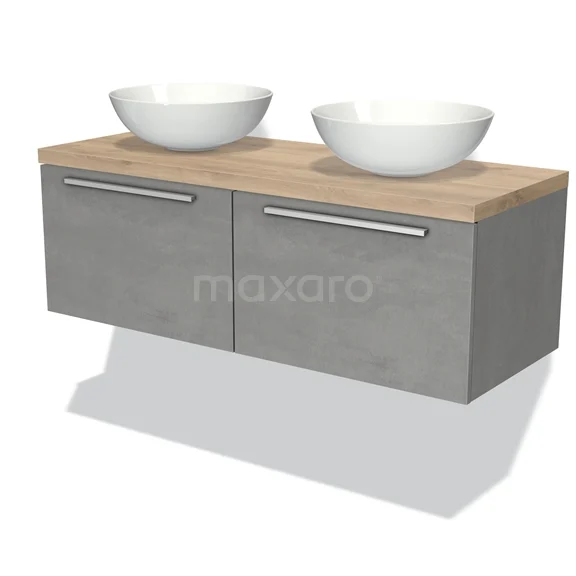 Modulo Plato Badmöbel mit Aufsatzwaschbecken | 120 cm Hellgrauer Beton Flach front Hellbraune Eiche blatt 2 nebeneinanderliegende Schubladen