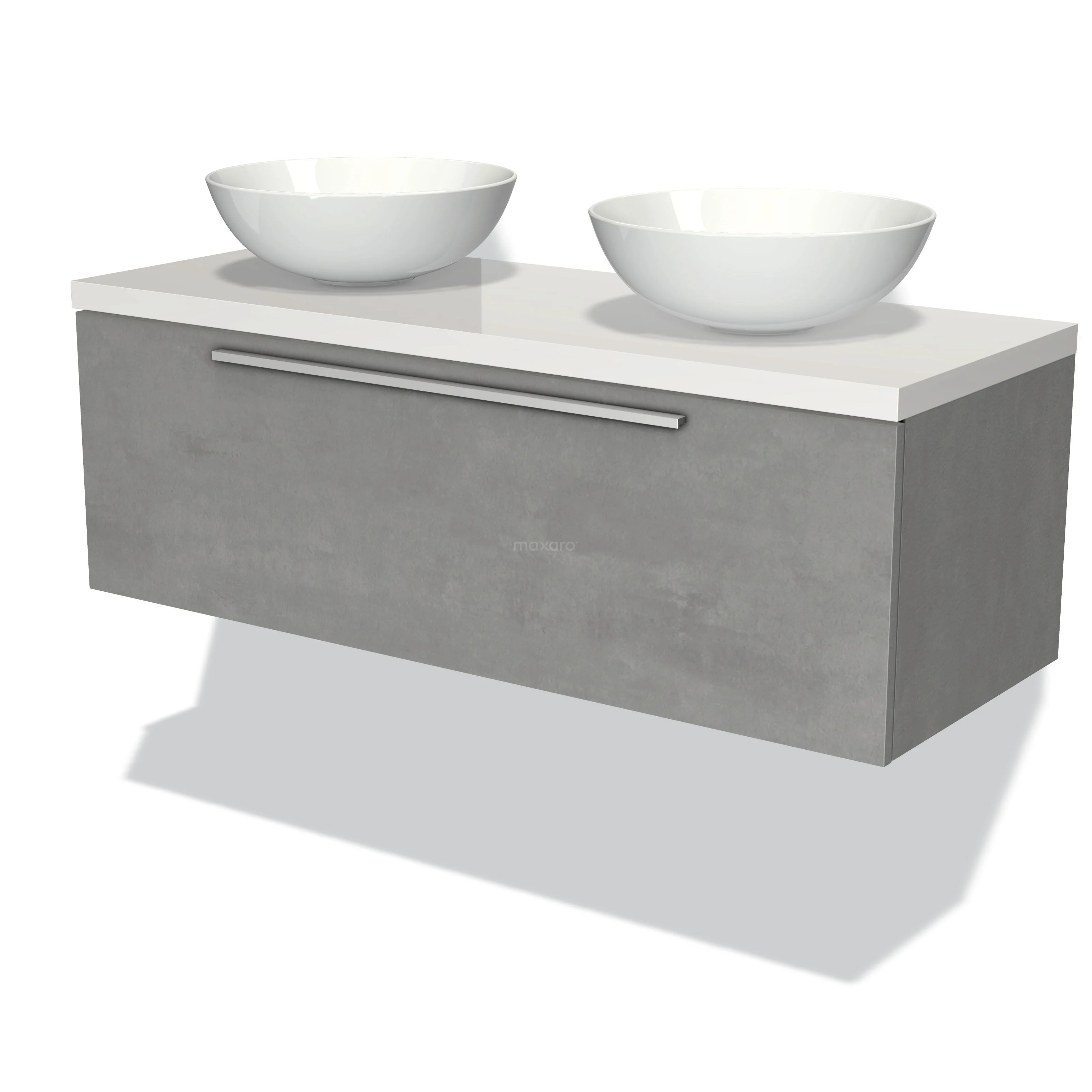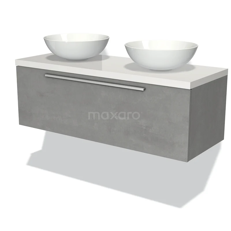 Modulo Plato Badmöbel mit Aufsatzwaschbecken | 120 cm Hellgrauer Beton Flach front Hochglanz Weiß blatt 1 Schublade