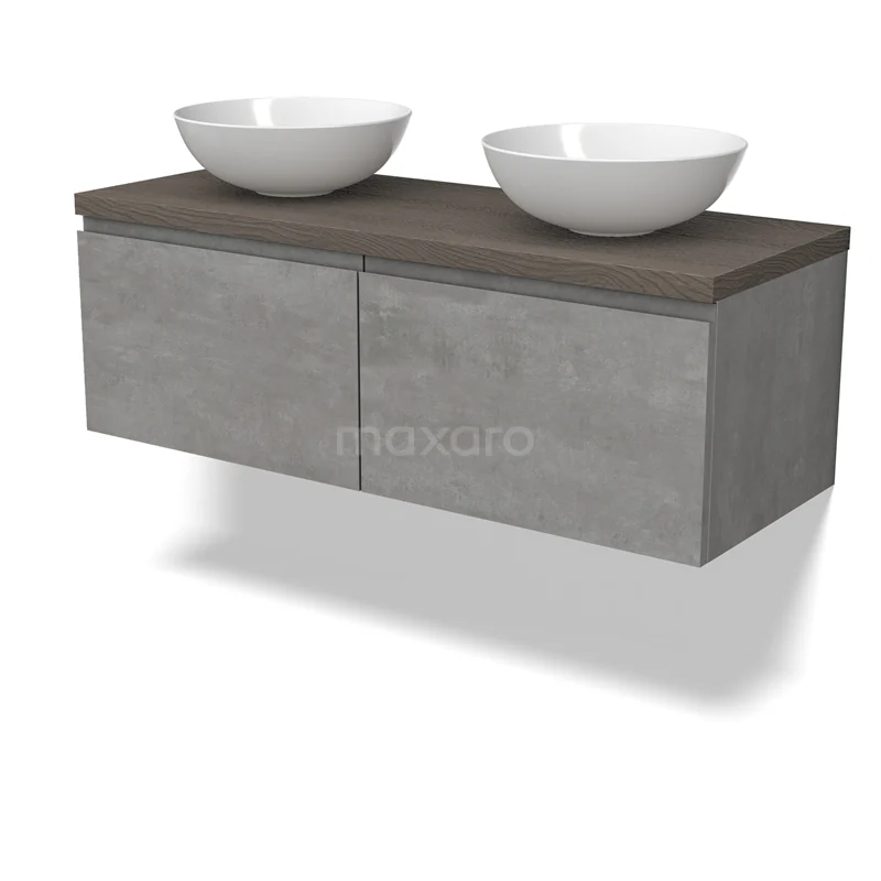Modulo Plato Badmöbel mit Aufsatzwaschbecken | 120 cm Hellgrauer Beton Grifflos front Dunkelbraune Eiche blatt 2 nebeneinanderliegende Schubladen