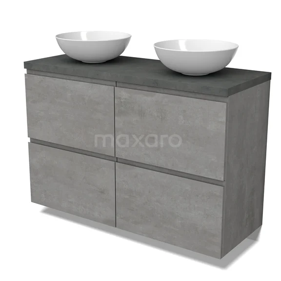 Modulo Plato Badmöbel mit Aufsatzwaschbecken | 120 cm Hellgrauer Beton Grifflos front Dunkelgrauer Beton blatt 4 hohe Schubladen