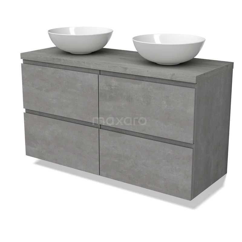 Modulo Plato Badmöbel mit Aufsatzwaschbecken | 120 cm Hellgrauer Beton Grifflos front Graue Eiche blatt 4 Schubladen