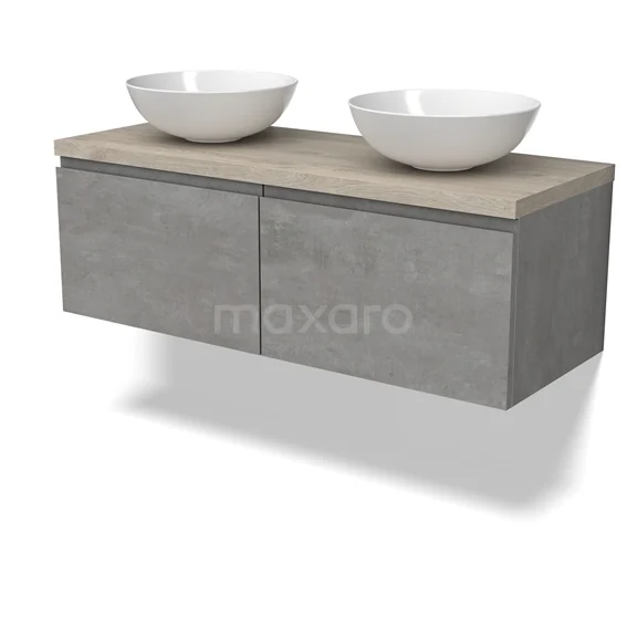 Modulo Plato Badmöbel mit Aufsatzwaschbecken | 120 cm Hellgrauer Beton Grifflos front Hellgraue Eiche blatt 2 nebeneinanderliegende Schubladen