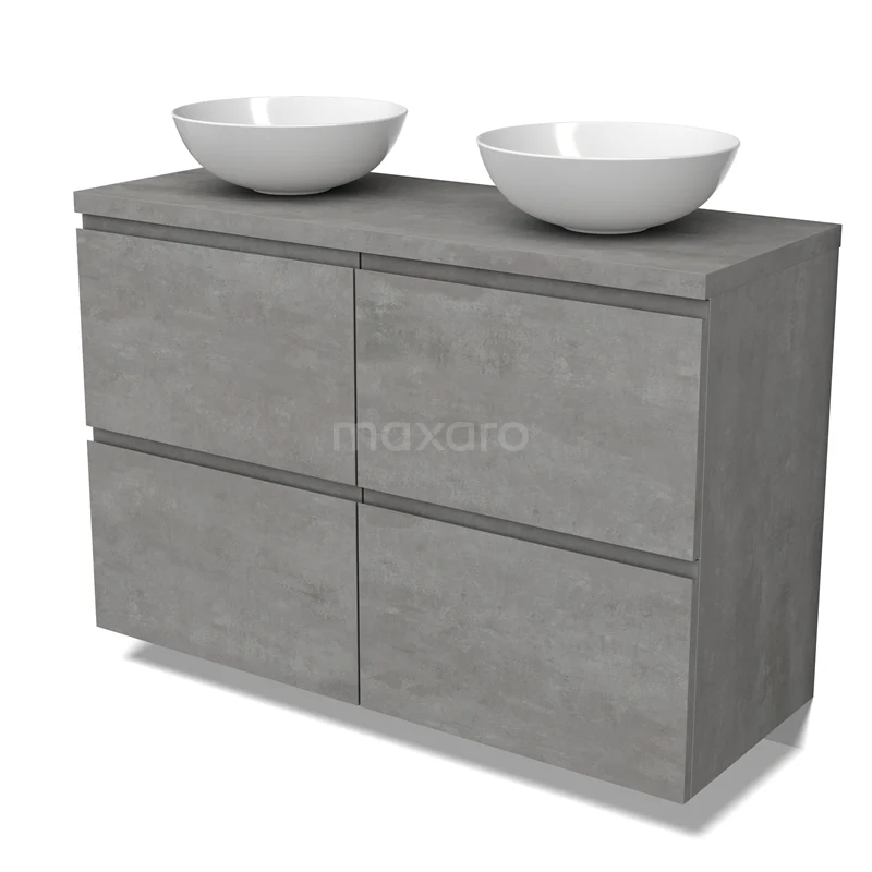 Modulo Plato Badmöbel mit Aufsatzwaschbecken | 120 cm Hellgrauer Beton Grifflos front Hellgrauer Beton blatt 4 hohe Schubladen
