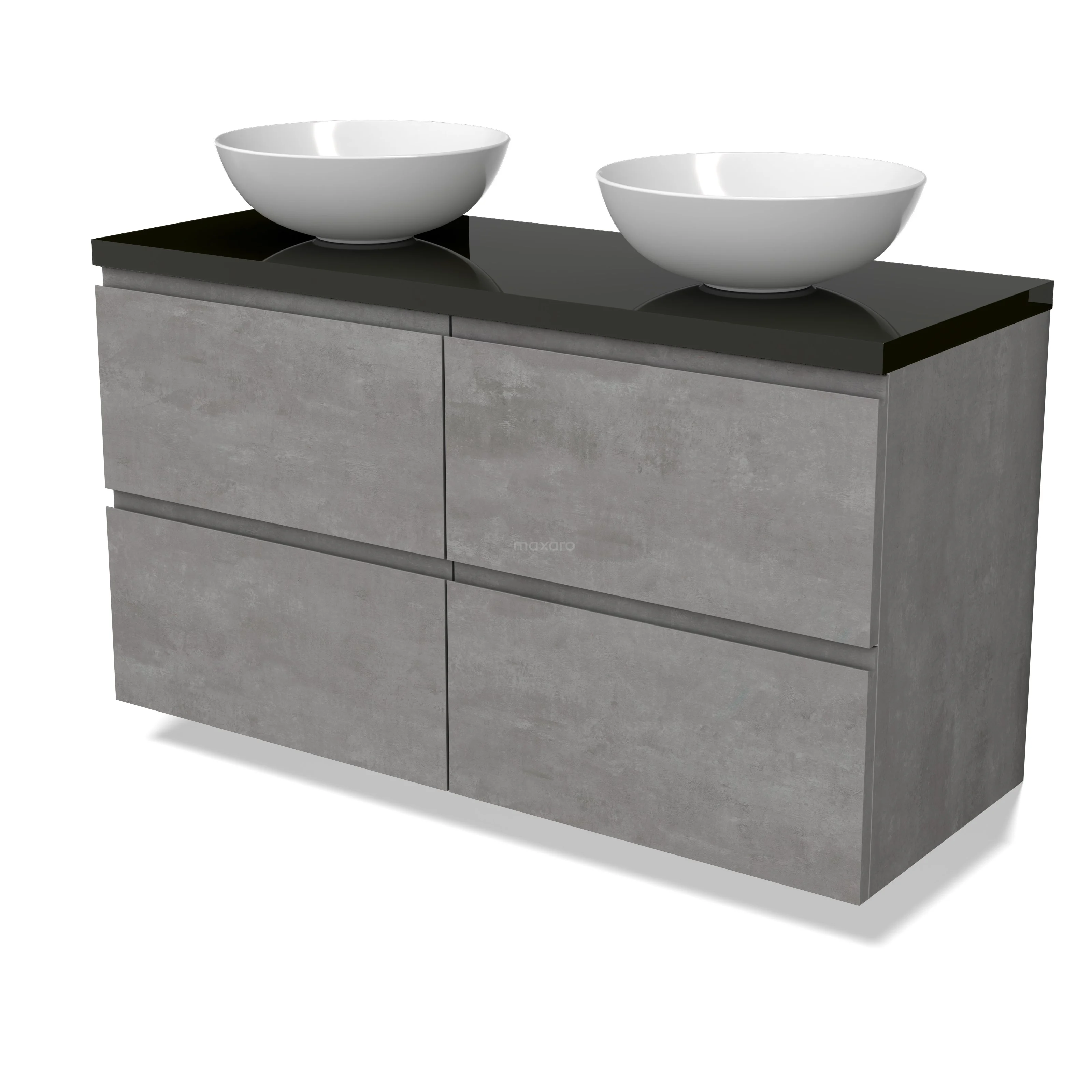 Modulo Plato Badmöbel mit Aufsatzwaschbecken | 120 cm Hellgrauer Beton Grifflos front Hochglanz Schwarz blatt 4 Schubladen