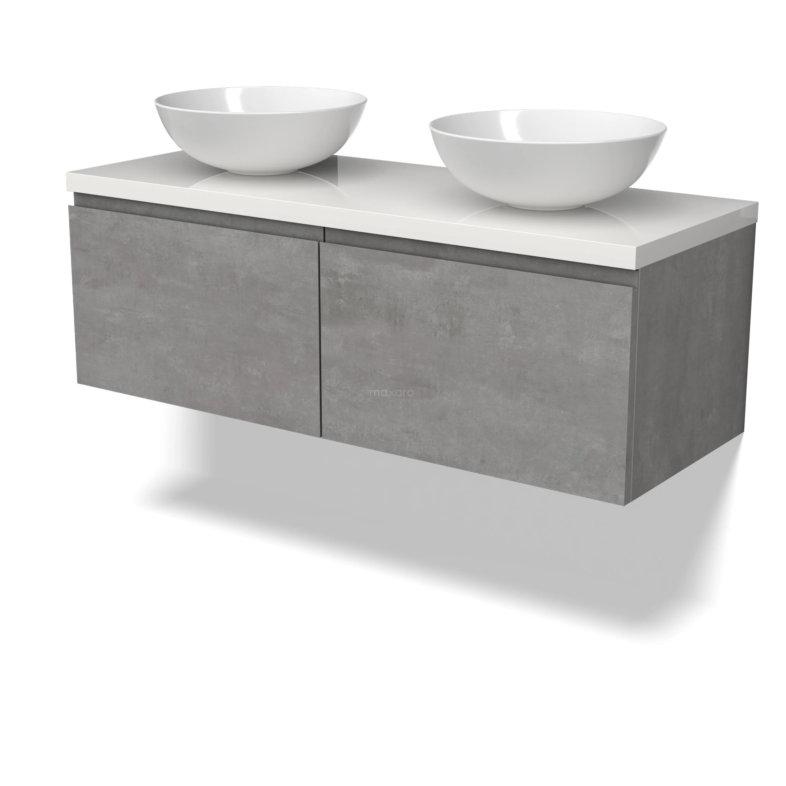 Modulo Plato Badmöbel mit Aufsatzwaschbecken | 120 cm Hellgrauer Beton Grifflos front Hochglanz Weiß blatt 2 nebeneinanderliegende Schubladen BMK12-01846
