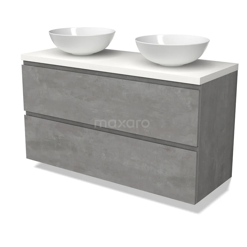 Modulo Plato Badmöbel mit Aufsatzwaschbecken | 120 cm Hellgrauer Beton Grifflos front Matt Weiß blatt 2 übereinanderliegende Schubladen