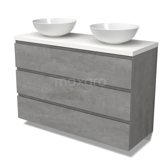 Modulo Plato Badmöbel mit Aufsatzwaschbecken | 120 cm Hellgrauer Beton Grifflos front Matt Weiß blatt 3 Schubladen