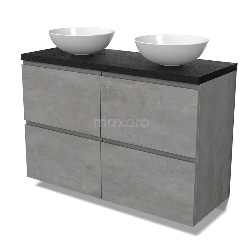 Modulo Plato Badmöbel mit Aufsatzwaschbecken | 120 cm Hellgrauer Beton Grifflos front Schwarze Eiche blatt 4 hohe Schubladen