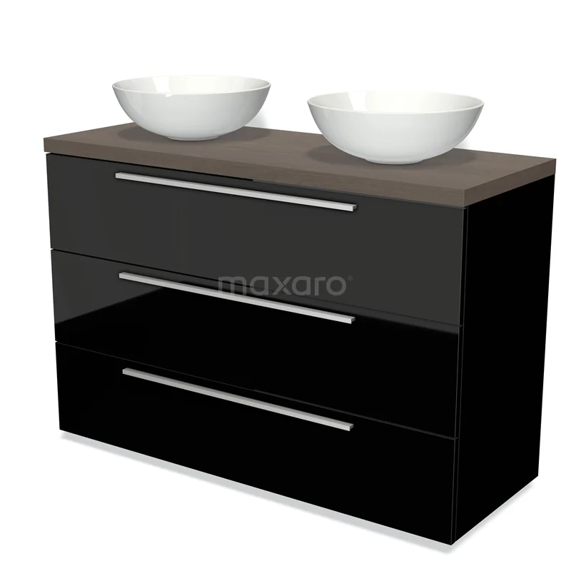 Modulo Plato Badmöbel mit Aufsatzwaschbecken | 120 cm Hochglanz Schwarz Flach front Dunkelbraune Eiche blatt 3 Schubladen