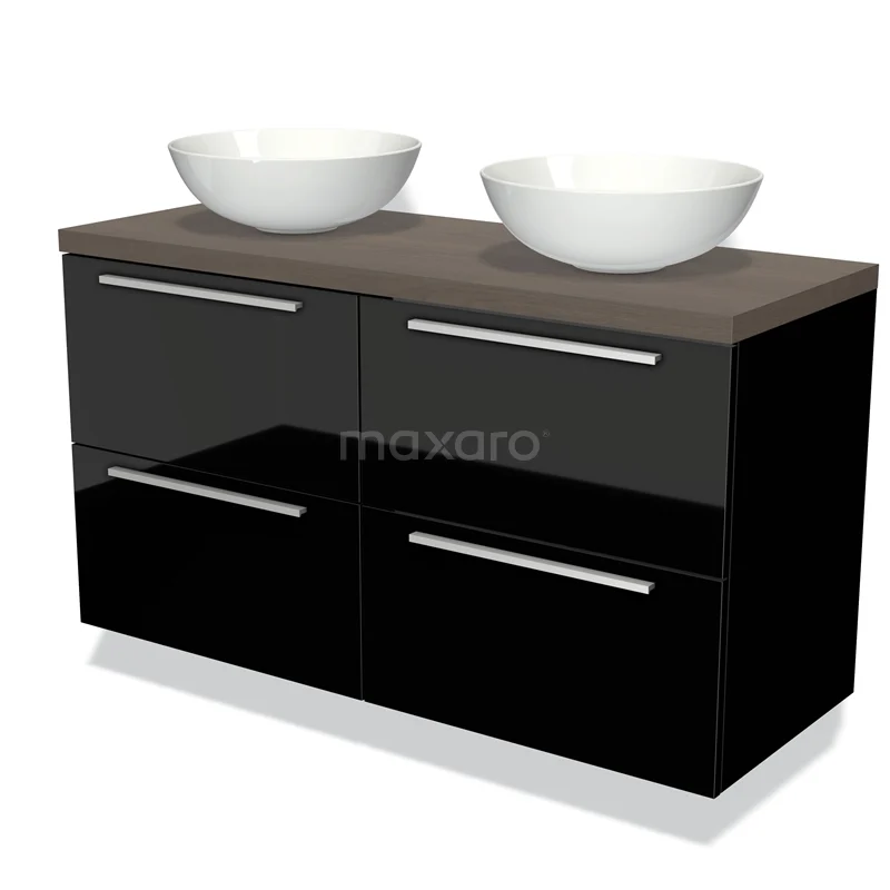 Modulo Plato Badmöbel mit Aufsatzwaschbecken | 120 cm Hochglanz Schwarz Flach front Dunkelbraune Eiche blatt 4 Schubladen