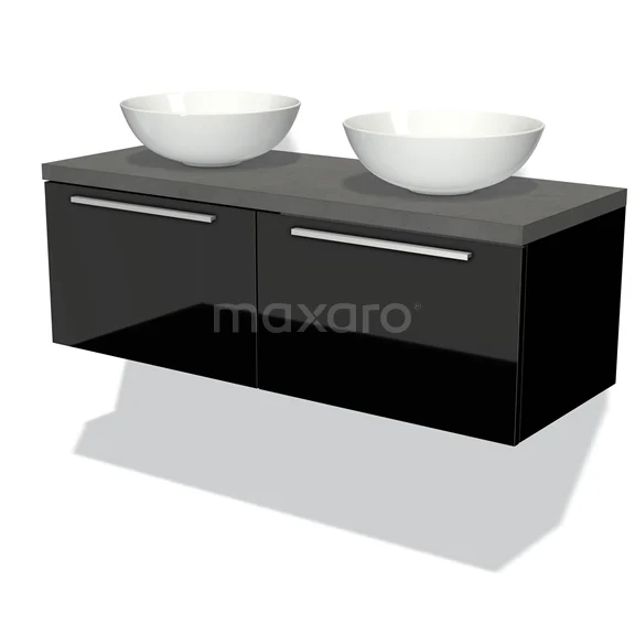Modulo Plato Badmöbel mit Aufsatzwaschbecken | 120 cm Hochglanz Schwarz Flach front Dunkelgrauer Beton blatt 2 nebeneinanderliegende Schubladen