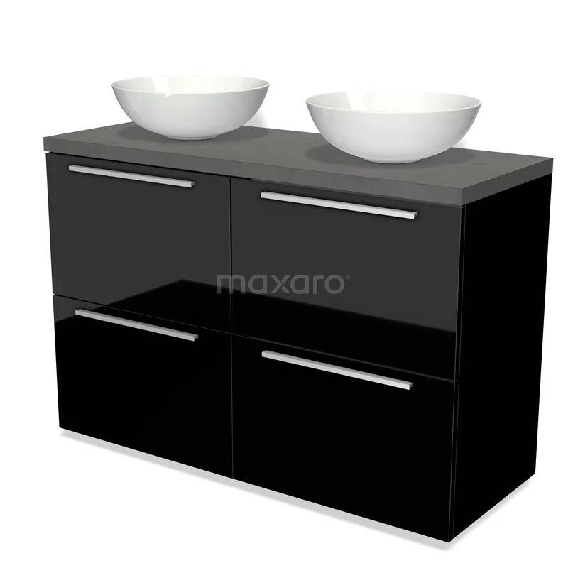 Modulo Plato Badmöbel mit Aufsatzwaschbecken | 120 cm Hochglanz Schwarz Flach front Dunkelgrauer Beton blatt 4 hohe Schubladen