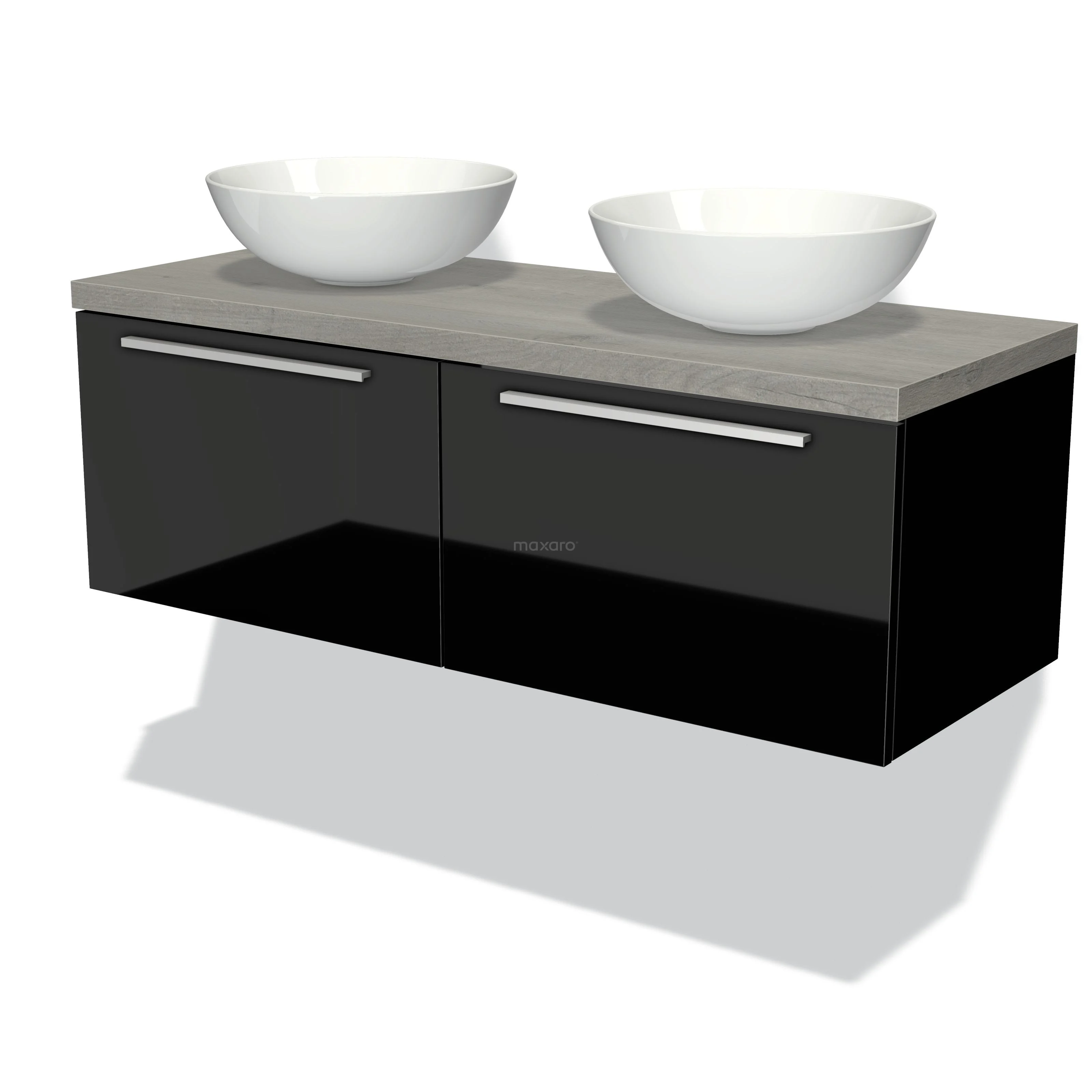 Modulo Plato Badmöbel mit Aufsatzwaschbecken | 120 cm Hochglanz Schwarz Flach front Graue Eiche blatt 2 nebeneinanderliegende Schubladen