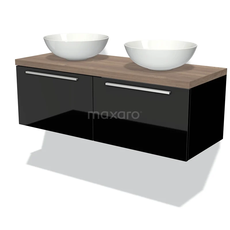 Modulo Plato Badmöbel mit Aufsatzwaschbecken | 120 cm Hochglanz Schwarz Flach front Mittelbraune Eiche blatt 2 nebeneinanderliegende Schubladen