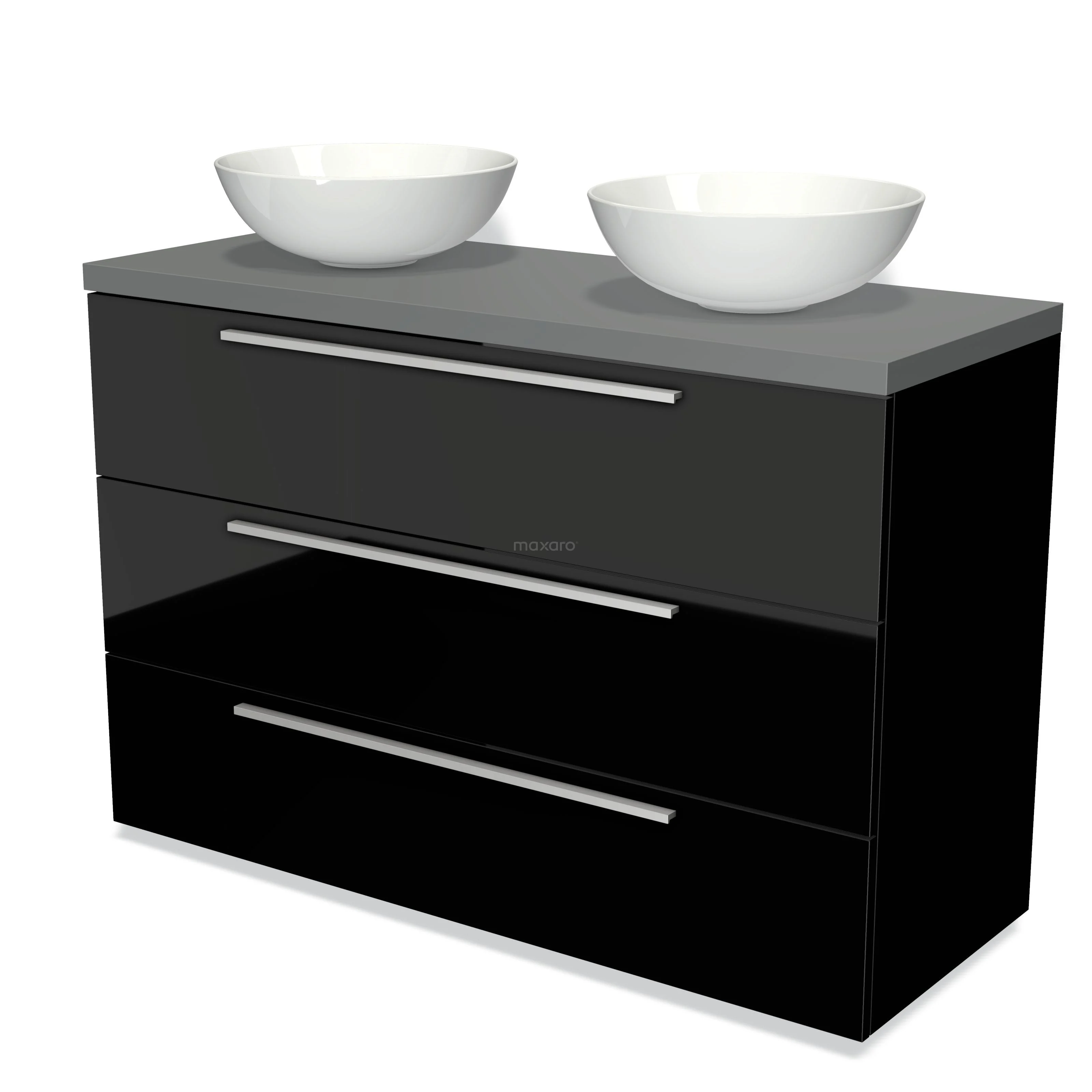 Modulo Plato Badmöbel mit Aufsatzwaschbecken | 120 cm Hochglanz Schwarz Flach front Mittelgrau blatt 3 Schubladen