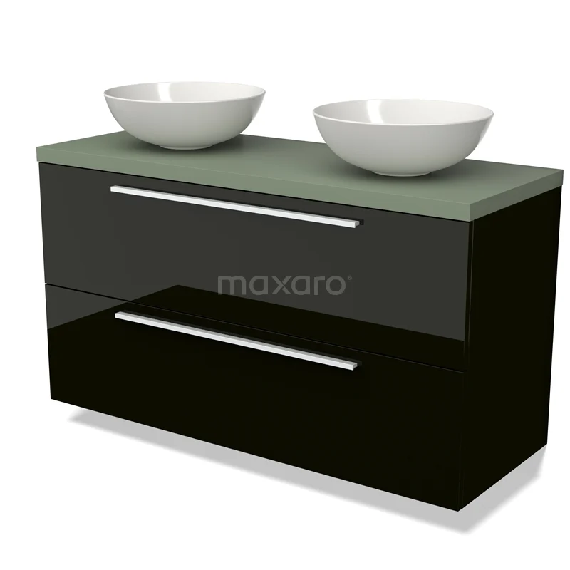 Modulo Plato Badmöbel mit Aufsatzwaschbecken | 120 cm Hochglanz Schwarz Flach front Salbeigrün blatt 2 übereinanderliegende Schubladen