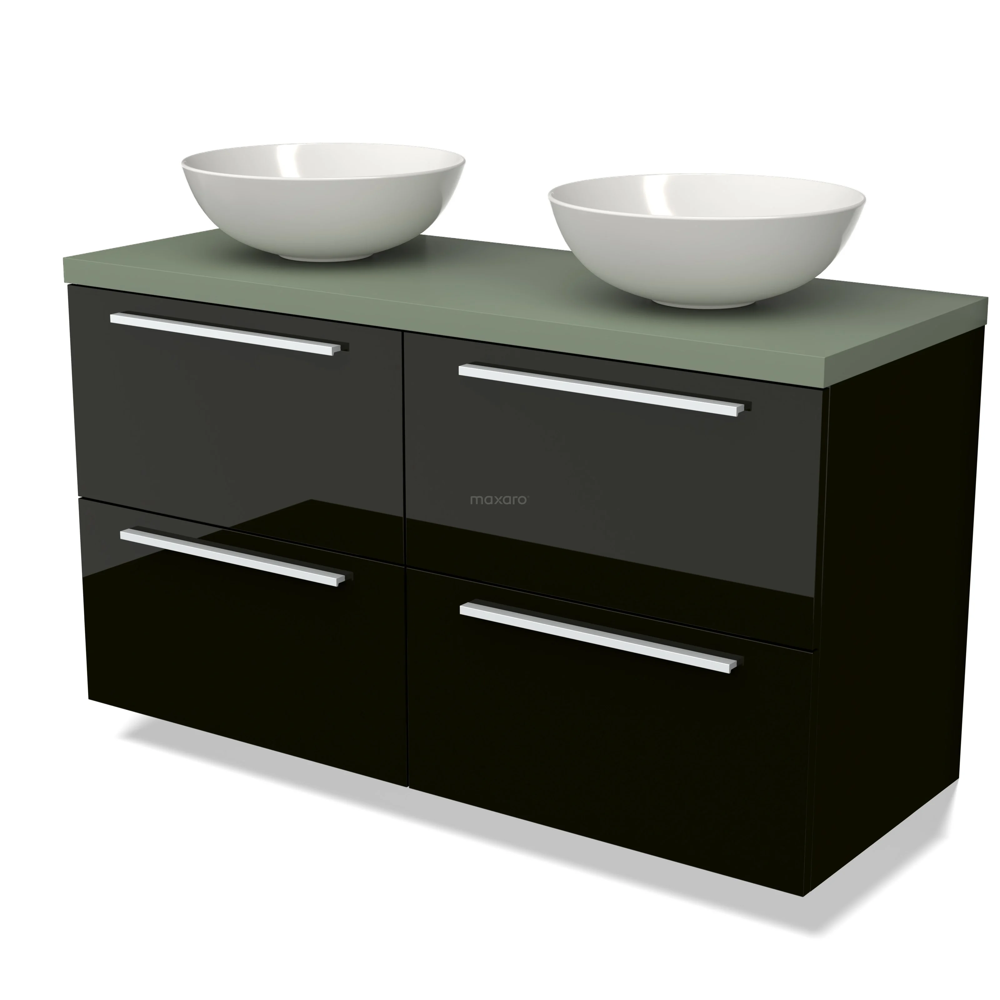 Modulo Plato Badmöbel mit Aufsatzwaschbecken | 120 cm Hochglanz Schwarz Flach front Salbeigrün blatt 4 Schubladen
