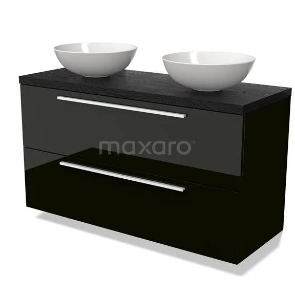 Modulo Plato Badmöbel mit Aufsatzwaschbecken | 120 cm Hochglanz Schwarz Flach front Schwarze Eiche blatt 2 übereinanderliegende Schubladen