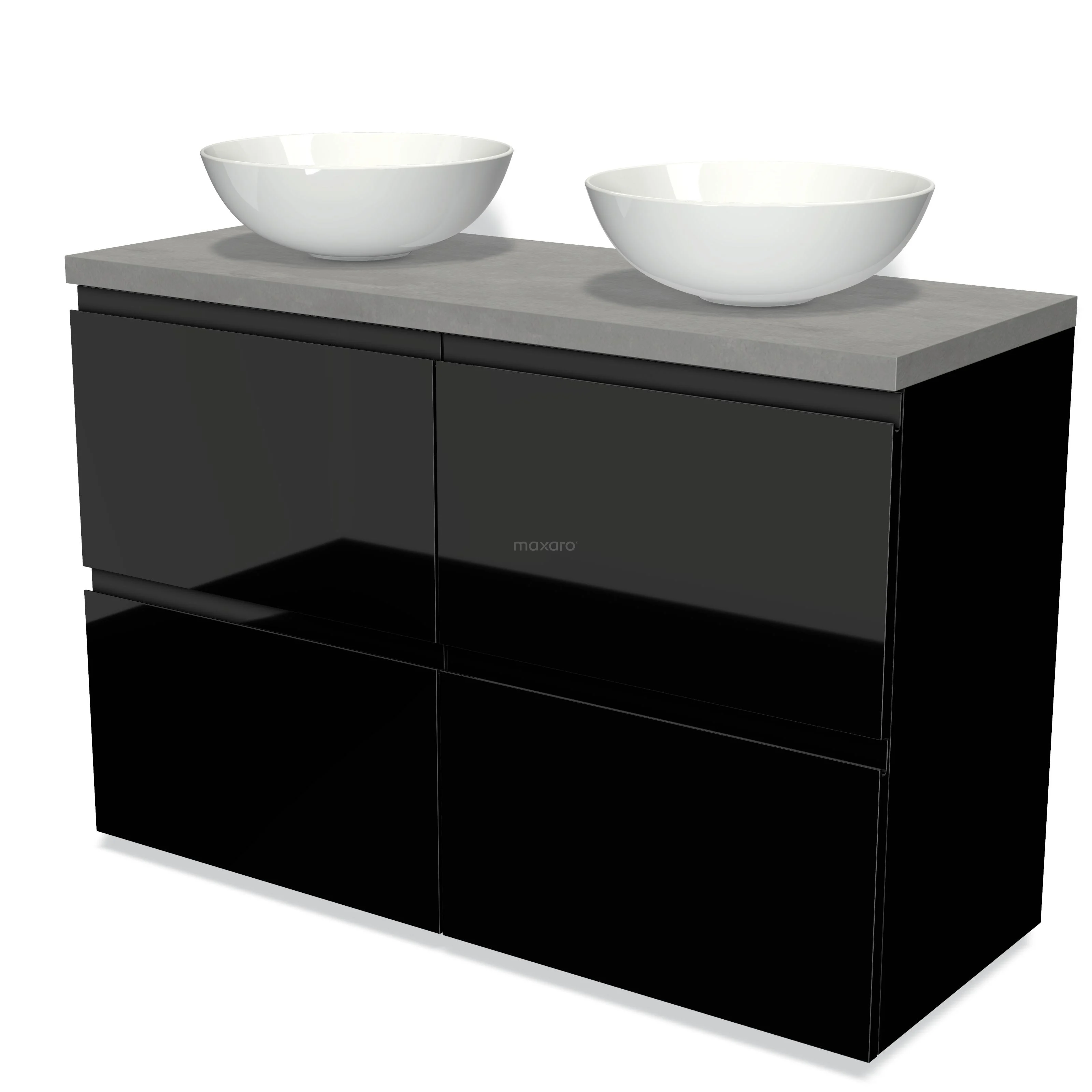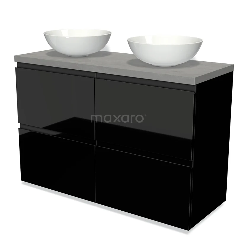 Modulo Plato Badmöbel mit Aufsatzwaschbecken | 120 cm Hochglanz Schwarz Grifflos front Hellgrauer Beton blatt 4 hohe Schubladen