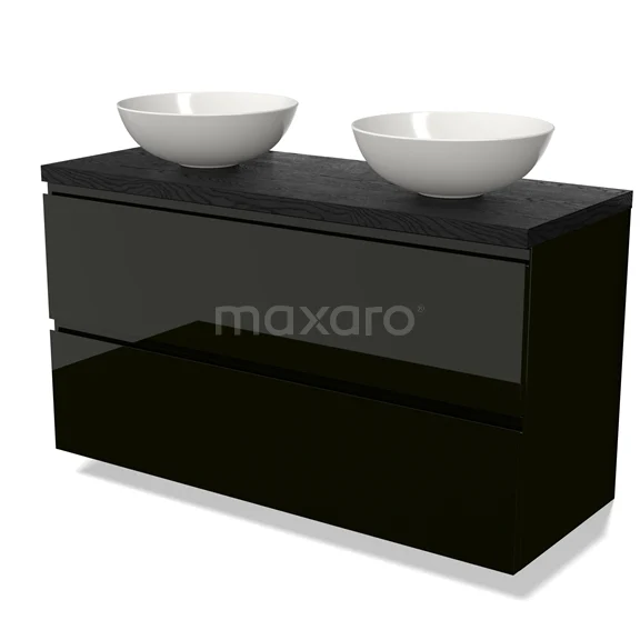 Modulo Plato Badmöbel mit Aufsatzwaschbecken | 120 cm Hochglanz Schwarz Grifflos front Schwarze Eiche blatt 2 übereinanderliegende Schubladen