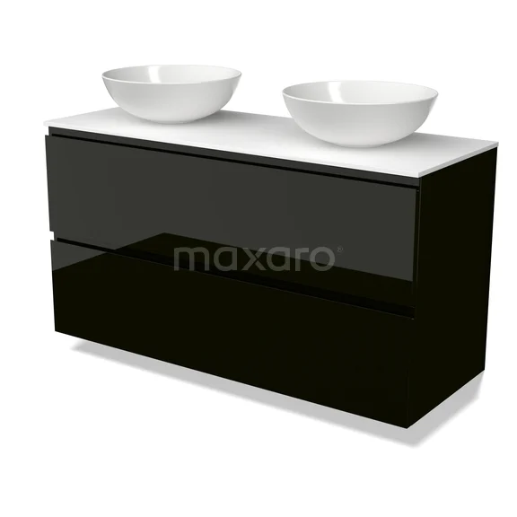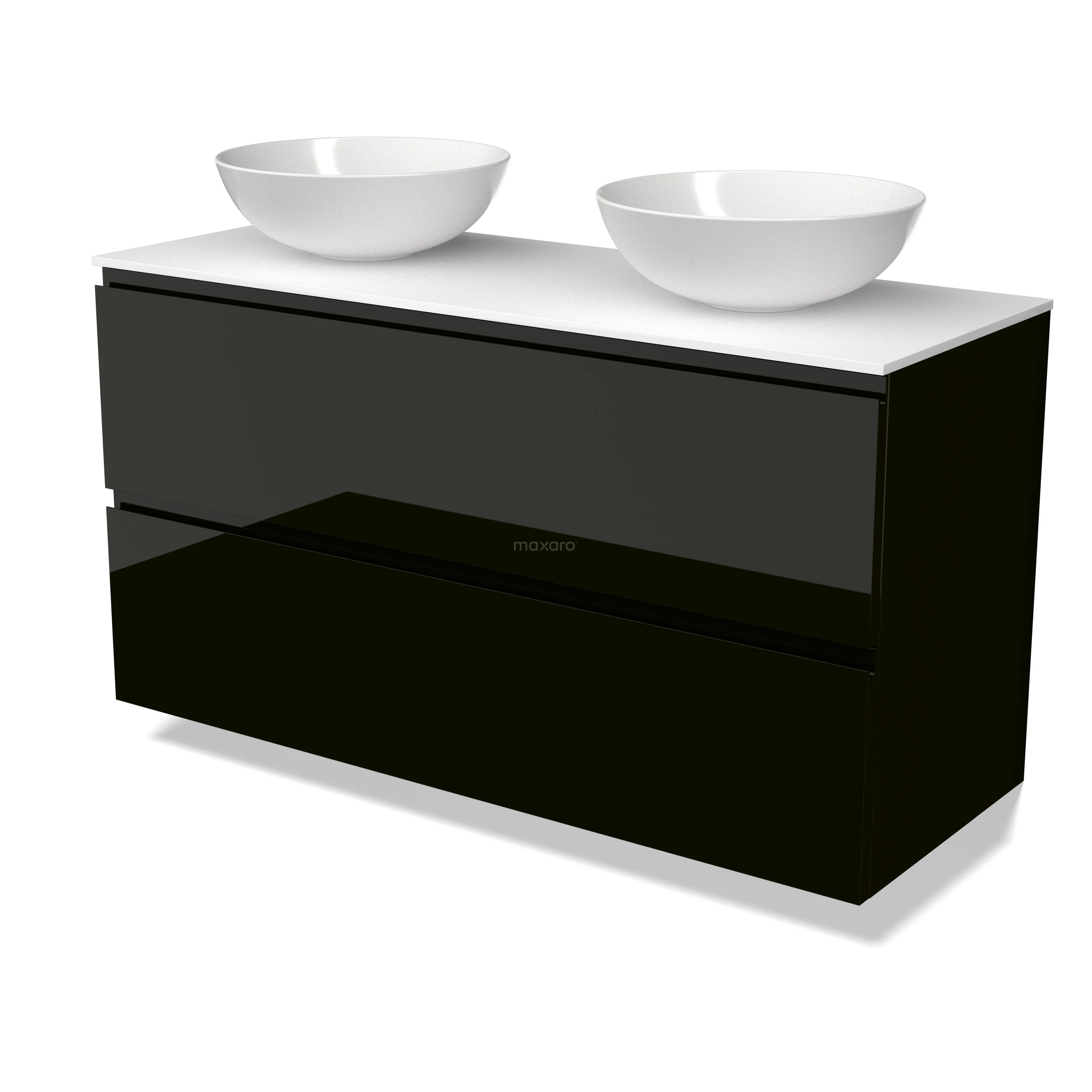 Modulo Plato Badmöbel mit Aufsatzwaschbecken | 120 cm Hochglanz Schwarz Grifflos front Solid Surface blatt 2 übereinanderliegende Schubladen