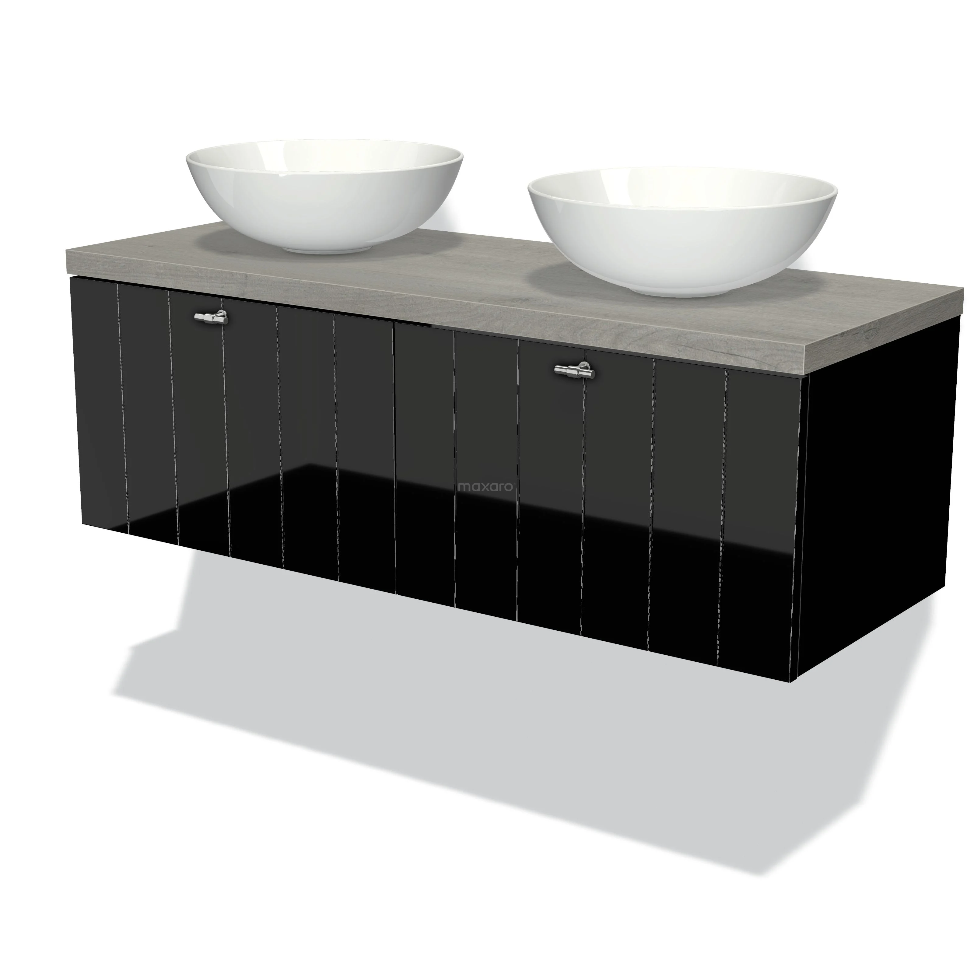 Modulo Plato Badmöbel mit Aufsatzwaschbecken | 120 cm Hochglanz Schwarz Lamelle front Graue Eiche blatt 2 nebeneinanderliegende Schubladen