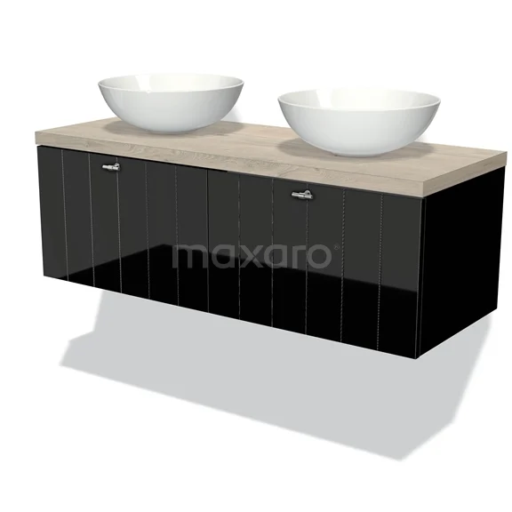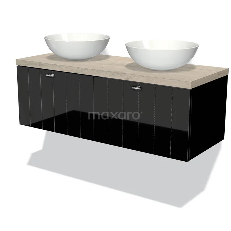 Modulo Plato Badmöbel mit Aufsatzwaschbecken | 120 cm Hochglanz Schwarz Lamelle front Hellgraue Eiche blatt 2 nebeneinanderliegende Schubladen